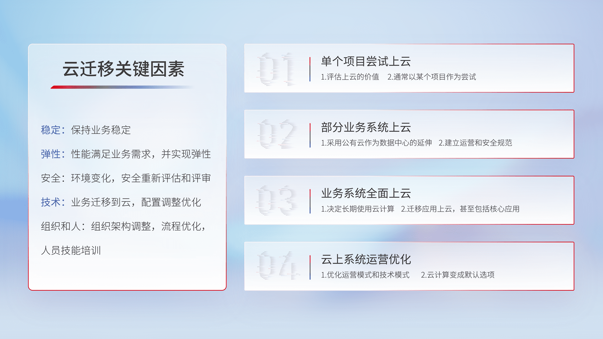 结合实际业务,,从规划设计、、、、云平台选型、、、云原生改造、、、、数据迁移、、、集成交付,,,迁移全过程为客户识别最佳上云路径,,,,做好风险识别管理,,设计网络架构、、身份权限、、、安全审计合规、、操作审计、、、、日志审计、、、监控告警策略、、多站点容灾设计等,,对云上基础设施进行整体规划,,提升IT治理水平,,以满足弹性、、高可用、、、高性能的需求。。