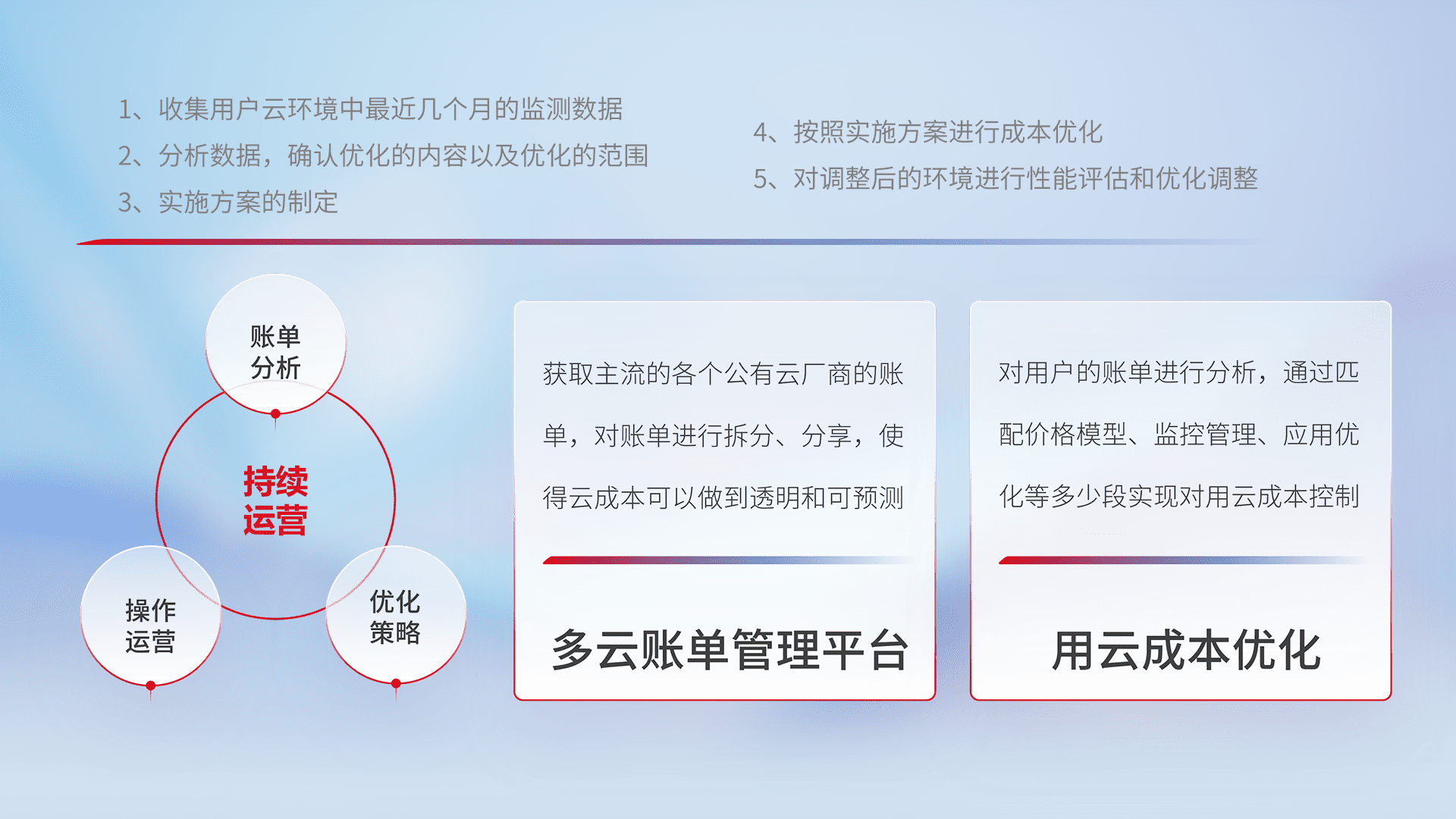 通过多云纳管,,,以统一的资源数据模型把客户的云资源进行抽象和封装,,,进而实现对多云资源的统一操作,,,保障云资源管理的可靠性、、、、稳定性与可用性。。。。量身定制化运维内容,,配置、、、、开发运维、、补丁管理、、、备份、、监控、、、、认证和访问管理、、、、审计和日常巡检等,,,,保障在用云过程中的可靠度,,稳定度以及高可用率。。